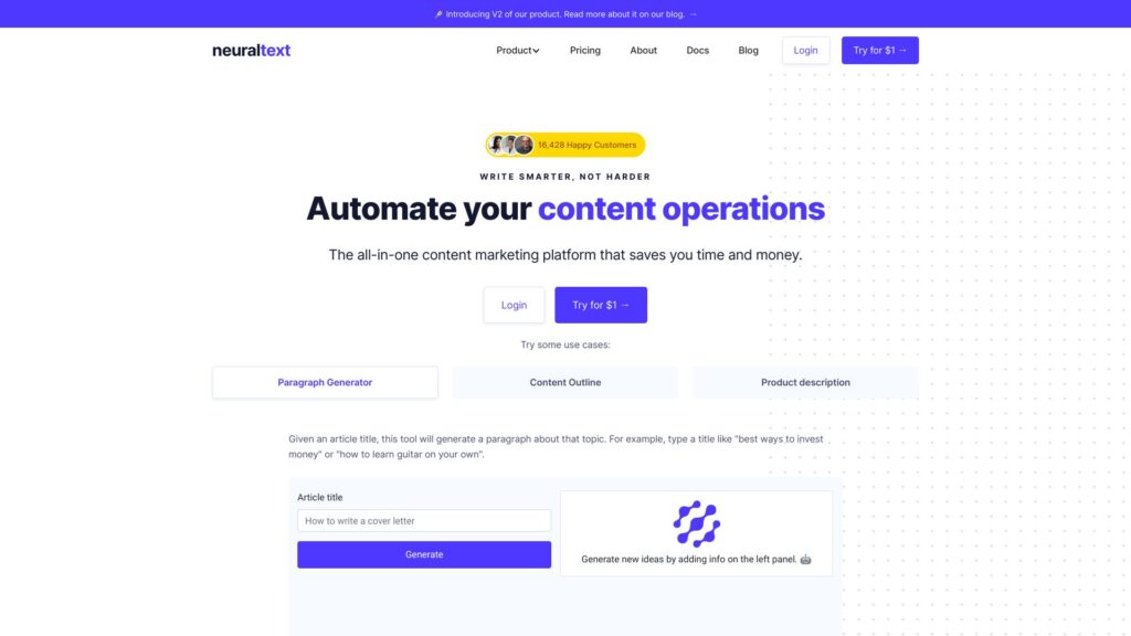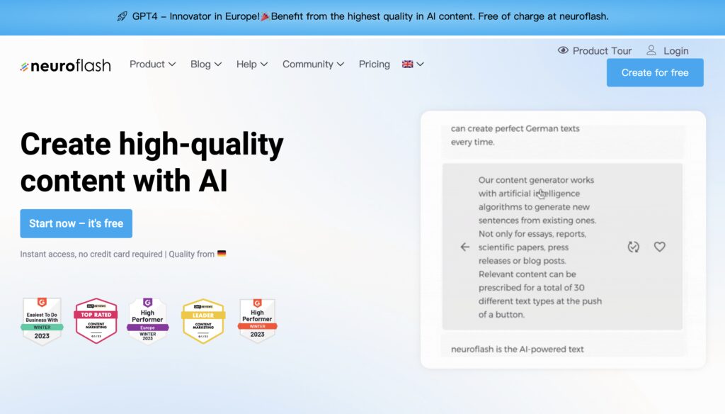 Neuroflash, Europe’s leading AI generator, offers an endless supply of premium content in 7 languages, complete with SEO and plagiarism checks.