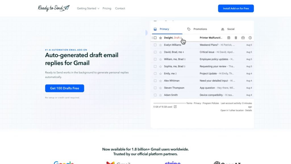 The Gmail Ready to Send add-on drafts AI-powered email responses to enhance productivity and save time.