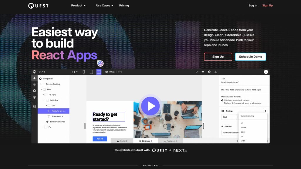 The Quest platform creates React components and produces clean code based on designs from Figma.