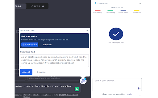 Use the PromptGenius extension to enhance your chatGPT prompts and save time.