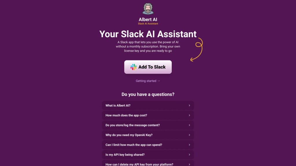To use Albert AI, simply install the Slack app, bring your own license key, and you’re ready to go!