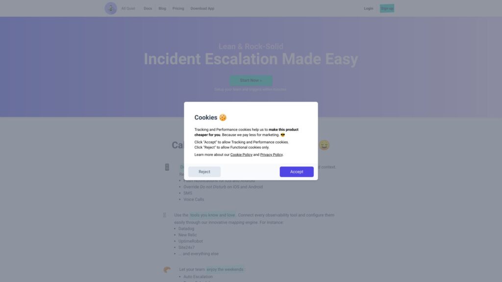 All Quiet is an IT incident escalation tool with instant feedback and escalation policies. It offers apps for iOS and Android tailored for software engineers, product managers, and dev-ops in small teams or multi-team orgs.