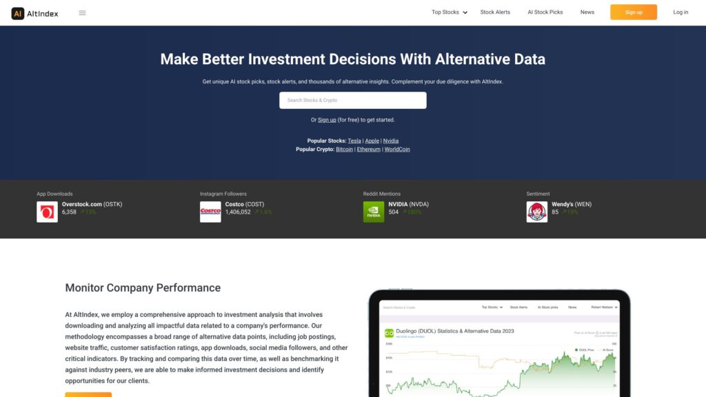 AltIndex is a platform that analyzes alternative stock and crypto data to provide unique AI stock picks, stock alerts, and thousands of alternative insights. It aggregates data from across the internet and presents it in an easy-to-use dashboard.
