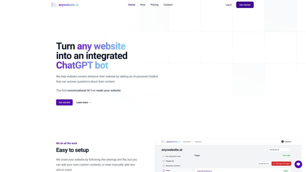 anywebsite.ai is a website that helps website owners enhance their websites by adding an AI-powered chatbot. This chatbot uses AI technology to answer questions about the website’s content. It reads the website’s content and provides relevant answers to users’ queries.