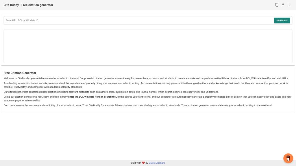 1. Enter the URL, DOI, or Wikidata ID of the source you want to cite.2. Click on the ‘Generate’ button.3. The citation generator will generate a properly formatted Bibtex citation with relevant metadata.4. Copy and paste the citation into your academic paper or reference list.