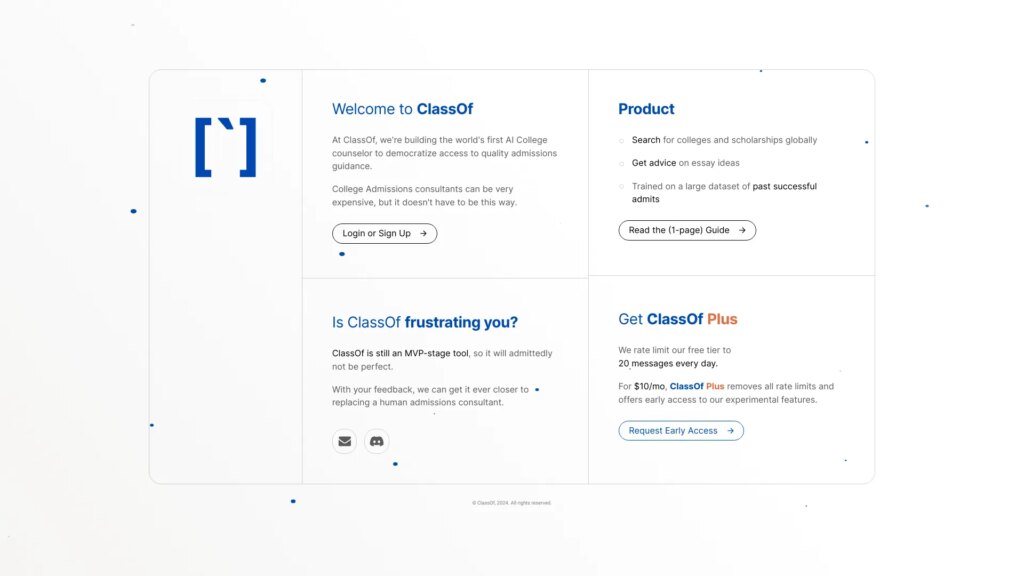 ClassOf AI is the world’s first AI-based college counselor, designed to provide quality admissions guidance, including college and scholarship search, essay advice, and long-term profile building strategy.