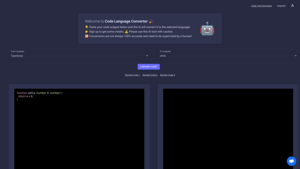Code Language Converter online uses artificial intelligence to quickly convert your code snippets from one programing language to another in a matter of seconds.