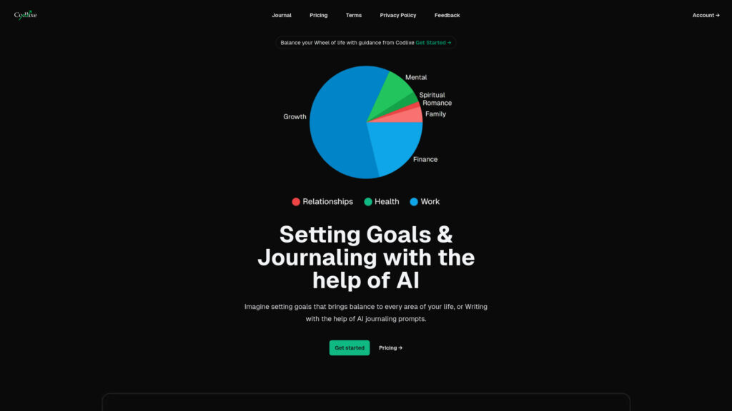 Codlixe is a goal-setting and journaling platform powered by AI, designed to help users set, track, visualize, and balance their personal goals using the Wheel of Life concept. It offers AI-generated suggestions for goals and provides journaling prompts to enhance self-reflection and productivity. Users can easily visualize their progress and maintain a balanced life across different categories, promoting self-motivation and personal growth.