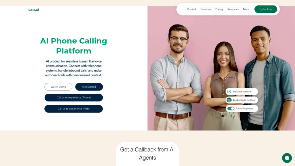 Cols AI is an AI Phone Calling Platform that provides human-like AI voice assistants with sub-1000ms latency to handle complex tasks in real-time. It enables seamless, instant support during customer calls, elevating customer service standards.