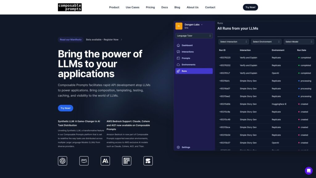 With Composable Prompts, you can rapidly develop APIs atop LLMs to power your applications. It allows you to compose powerful prompts, reuse them across your applications, and test them in different environments. You can also optimize performance and cost using intelligent caching and easily switch between models and runtime environments.