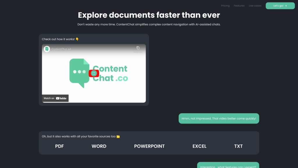 ContentChat supports PDF, Word, PowerPoint, Excel, and TXT file formats.