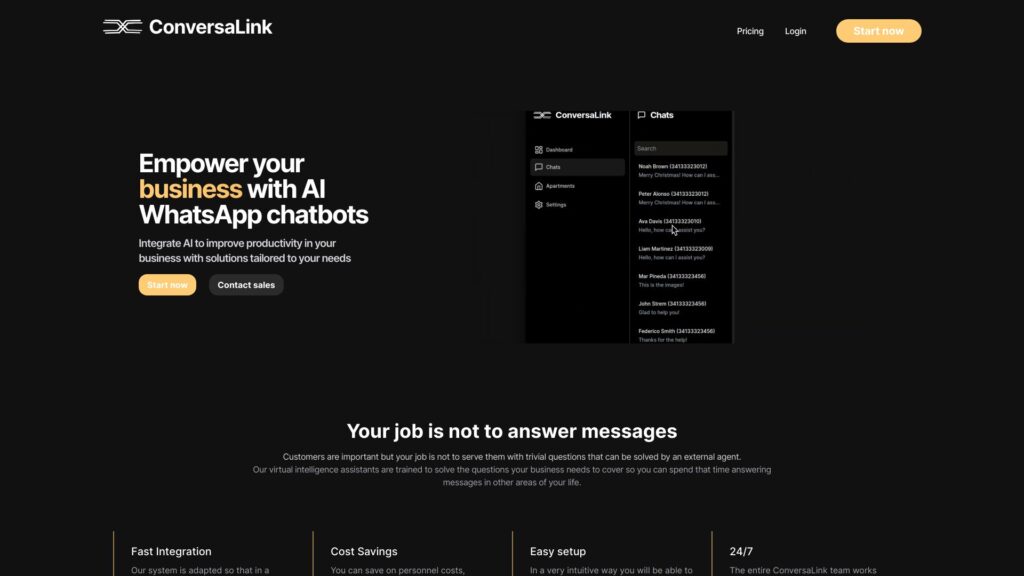 ConversaLink offers fast integration, cost savings, easy setup, 24/7 support, virtual intelligence trained for your business, all-in-one dashboard, multilingual support, audio recognition, Airbnb integration, image AI recognition, conversation context, high-quality support, simplified reach, and analytics.