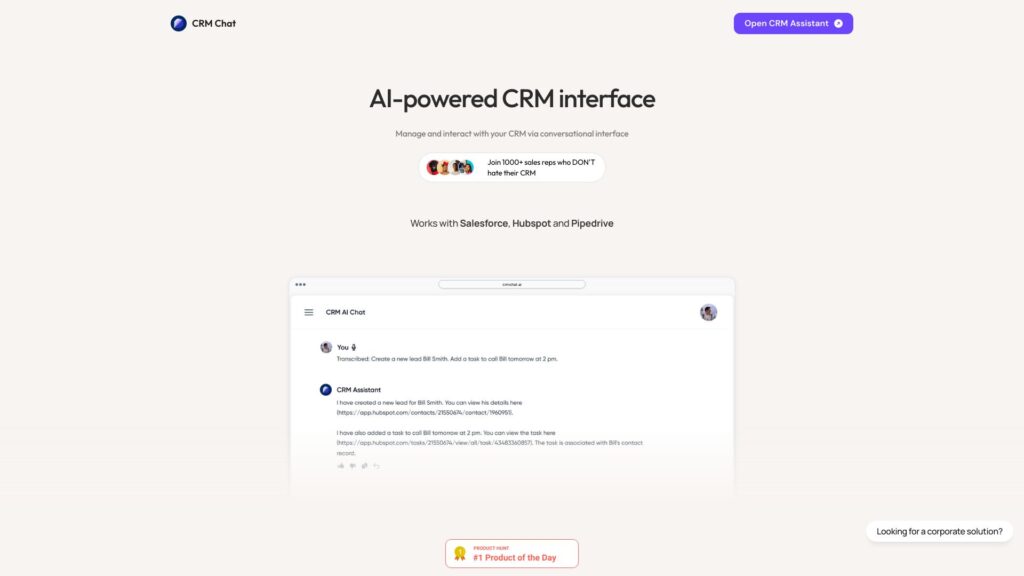CRM Chat is an AI-powered CRM interface that allows you to manage and interact with your CRM via a conversational interface. It creates and retrieves CRM data through chat and voice interactions, supporting integration with HubSpot, Pipedrive, and Salesforce.