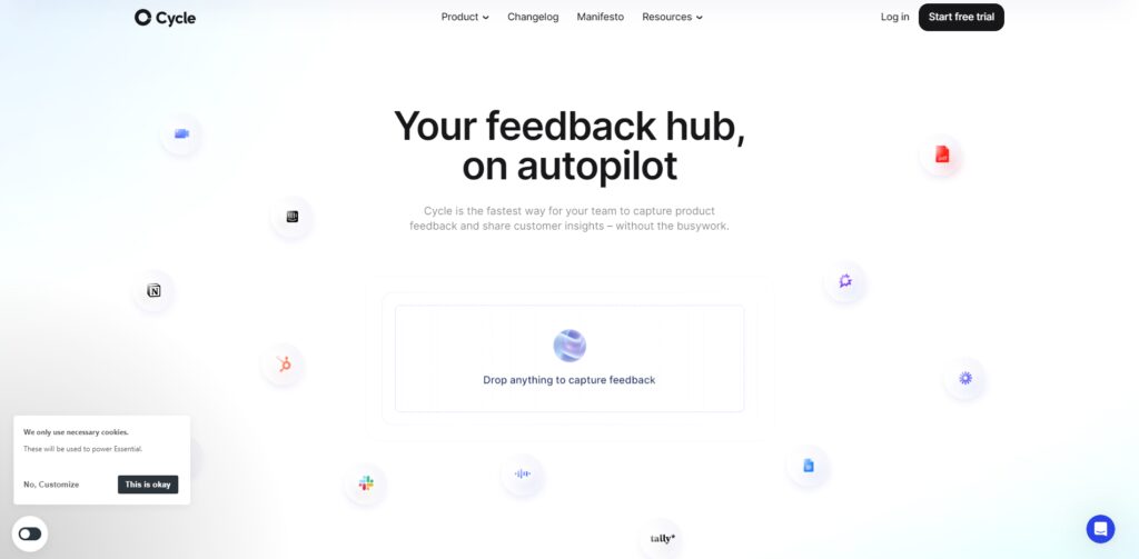 Cycle allows you to connect your sources such as Slack, Intercom, HubSpot, Email, and more to capture feedback with context.
