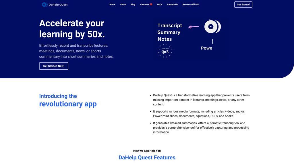 DaHelp Quest is an innovative learning app that allows users to capture, summarize, and master knowledge effortlessly. It supports various media formats, including articles, videos, audios, PowerPoint slides, documents, equations, PDFs, and books. The app generates detailed notes and summaries, offers automatic transcription, and provides a comprehensive tool for effectively capturing and processing information.