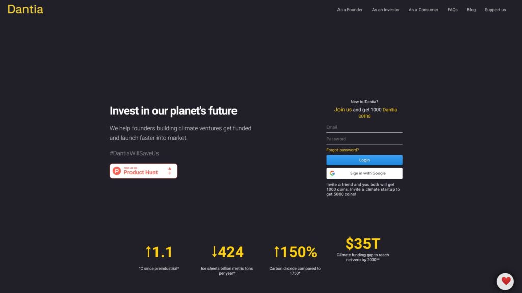 As a Founder, you can connect with the right people, validate your idea, and raise capital. As an Investor, you can join a growing network of climate-conscious investors and build your portfolio. As a Consumer, you can find climate-positive companies, join the global movement, and leverage personalized recommendations.