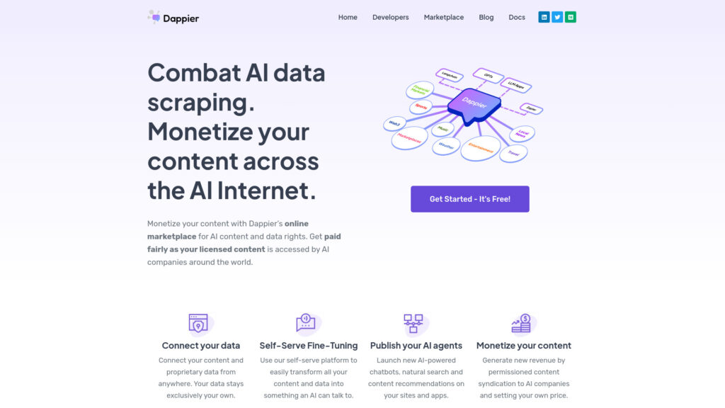 Dappier is the world’s first online marketplace for AI content and data rights. It allows users to monetize their content by licensing it to AI companies. Users can connect their data sources, fine-tune AI agents, publish AI-powered chatbots, and set their price for content syndication.