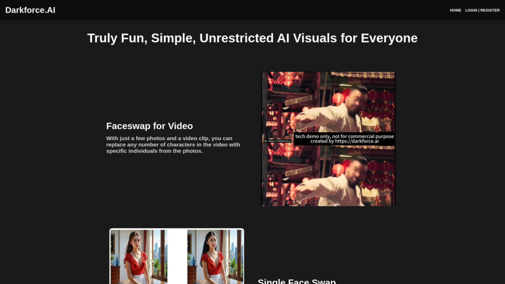 DarkForce AI is an unrestricted AI tool for face swapping and image generation. It provides predefined workflow for promising results without requiring AI knowledge.