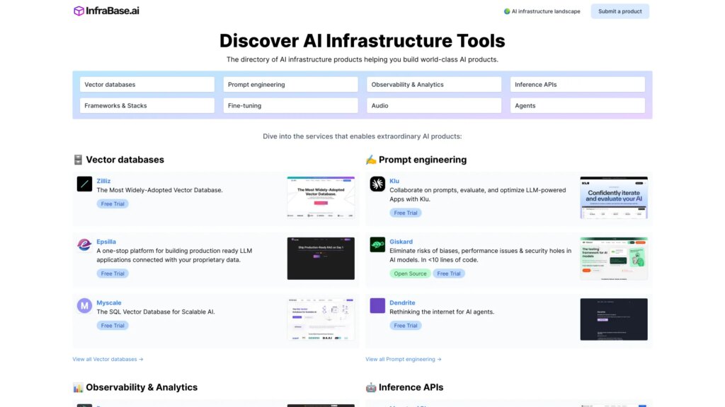 Explore the website to find and learn about various AI infrastructure tools and services.