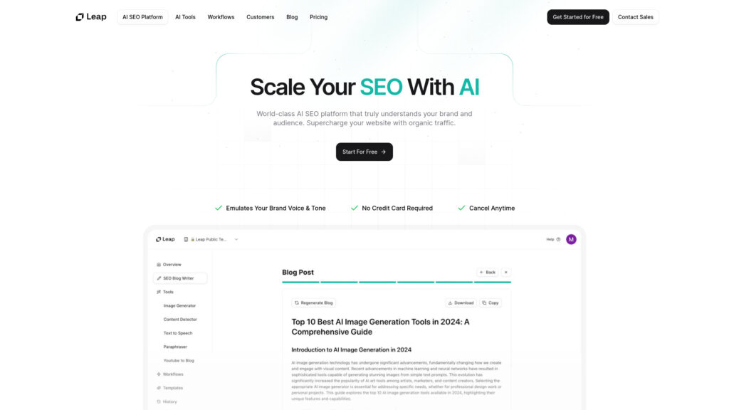 Leap AI SEO Platform is an integrated AI-powered tool designed to supercharge businesses by generating fully researched SEO content that resonates with the brand’s voice and engages the audience. It eliminates the guesswork in keyword research and offers out-of-the-box support for various content formats like articles, blog posts, and listicles.
