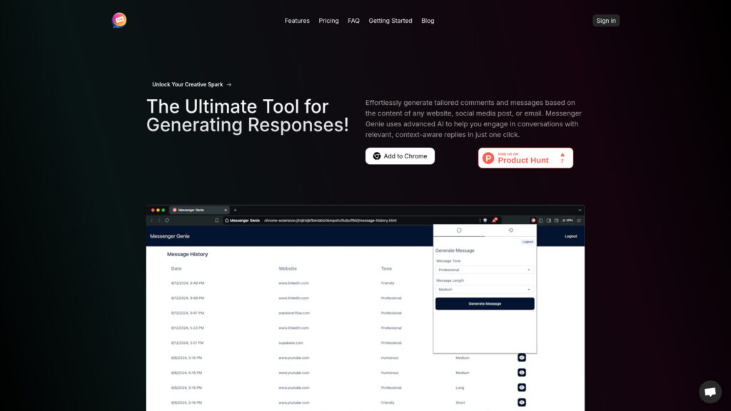 Messenger Genie is an AI-powered Chrome extension that generates contextually relevant messages and comments.